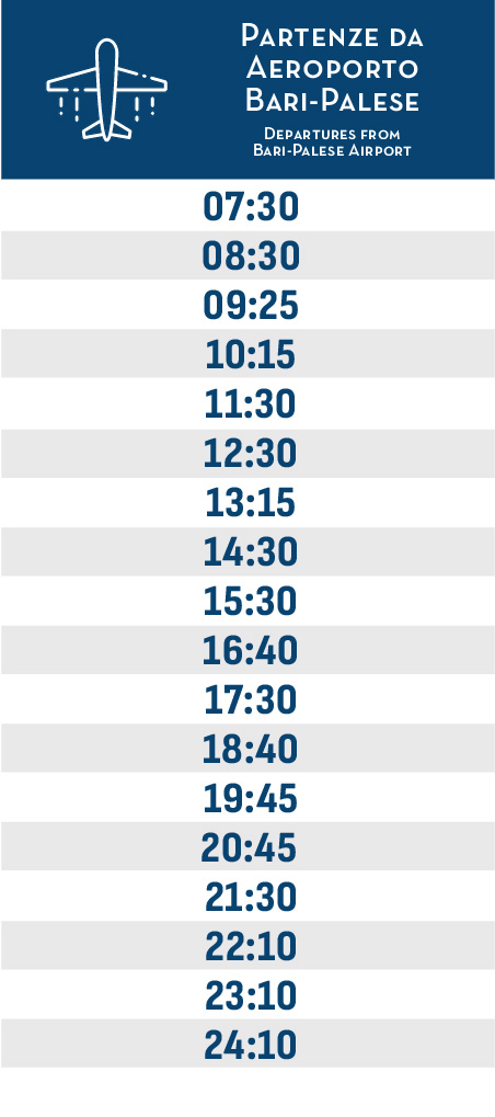 I nostri bus garantiscono, in soli 30 minuti, il collegamento dalla Stazione Centrale di Bari all’Aeroporto di Bari e viceversa, a pochi metri dal punto di imbarco delle partenze. Il servizio ha le fermate di fronte all’uscita arrivi e partenze dell’aeroporto, alla Stazione Centrale e nei punti strategici del centro di Bari per permettere a tutti di prendere i nostri shuttle-bus e viaggiare comodamente seduti. I nostri autisti, esperti e qualificati, si prenderanno cura del vostro bagaglio caricandolo e consegnandolo all’arrivo. Buon viaggio.